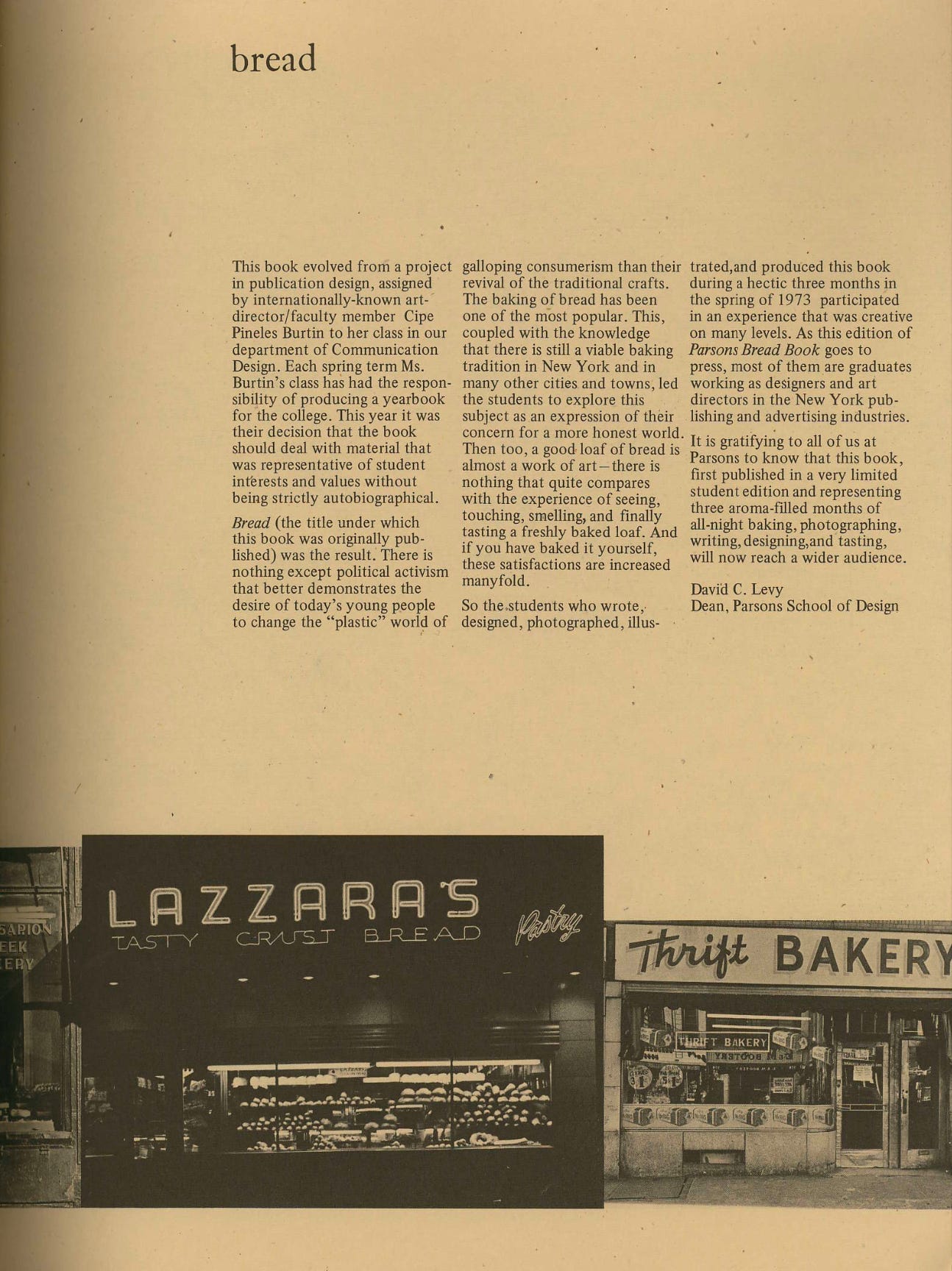 One of my favorite bread books is the Parsons Bread Book, created in 1974 by students in not-renowned-enough graphic designer and illustrator Cipe Pineles’s editorial class at the Parsons School of Design. It contains a series of profiles and photographic portraits of bakeries in and around New York City, many of which are no longer in operation.