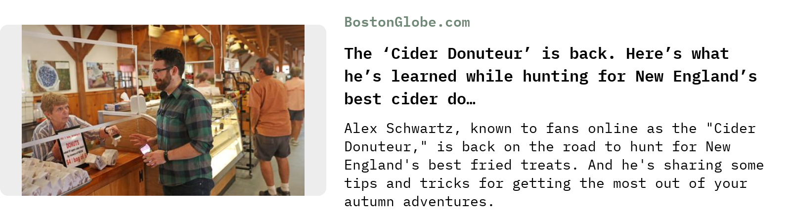 …Schwartz, known to legions of fans online as the “Cider Donuteur,” has already begun making pit stops at many of the region’s apple cider purveyors.