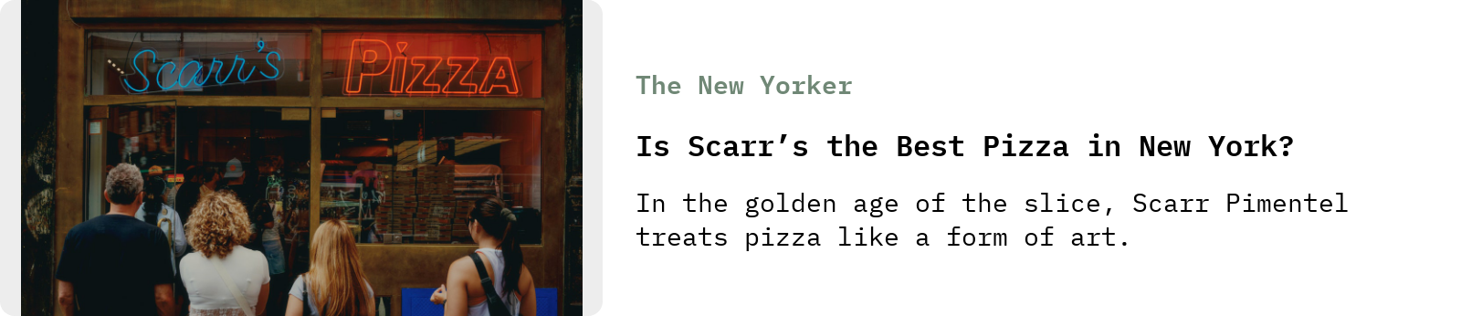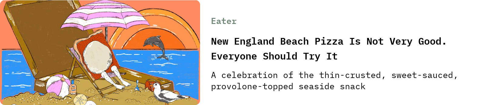 And then there’s Hannah Seliger’s ode to New England beach pizza, a hyper-local style of pizza from a short stretch of shoreline straddling the Merrimack River in Massachusetts and New Hampshire, which reads like a companion piece to Helen’s: