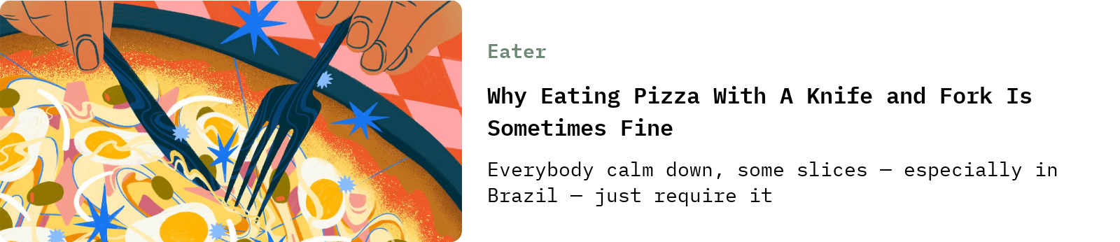 How our former *president chooses to eat his pies notwithstanding, it’s fine to use a knife and a fork to eat pizza, especially when the style of pie dictates it. This recent piece at Eater is all about why pizza in Brazil demands utensils for safe consumption: