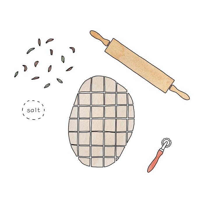 On a generous floured flat surface, roll out one piece of dough at the time until it’s as thin as the caraway seeds (see shape ideas below). If using, sprinkle some flaky sea salt on top and roll a few more times to get the salt to stick better. The crispbread will bake well as is, but if you don’t want the crispbread to puff up during baking, I suggest pricking the surface with a fork or roll it once or twice with a knobby rolling pin.