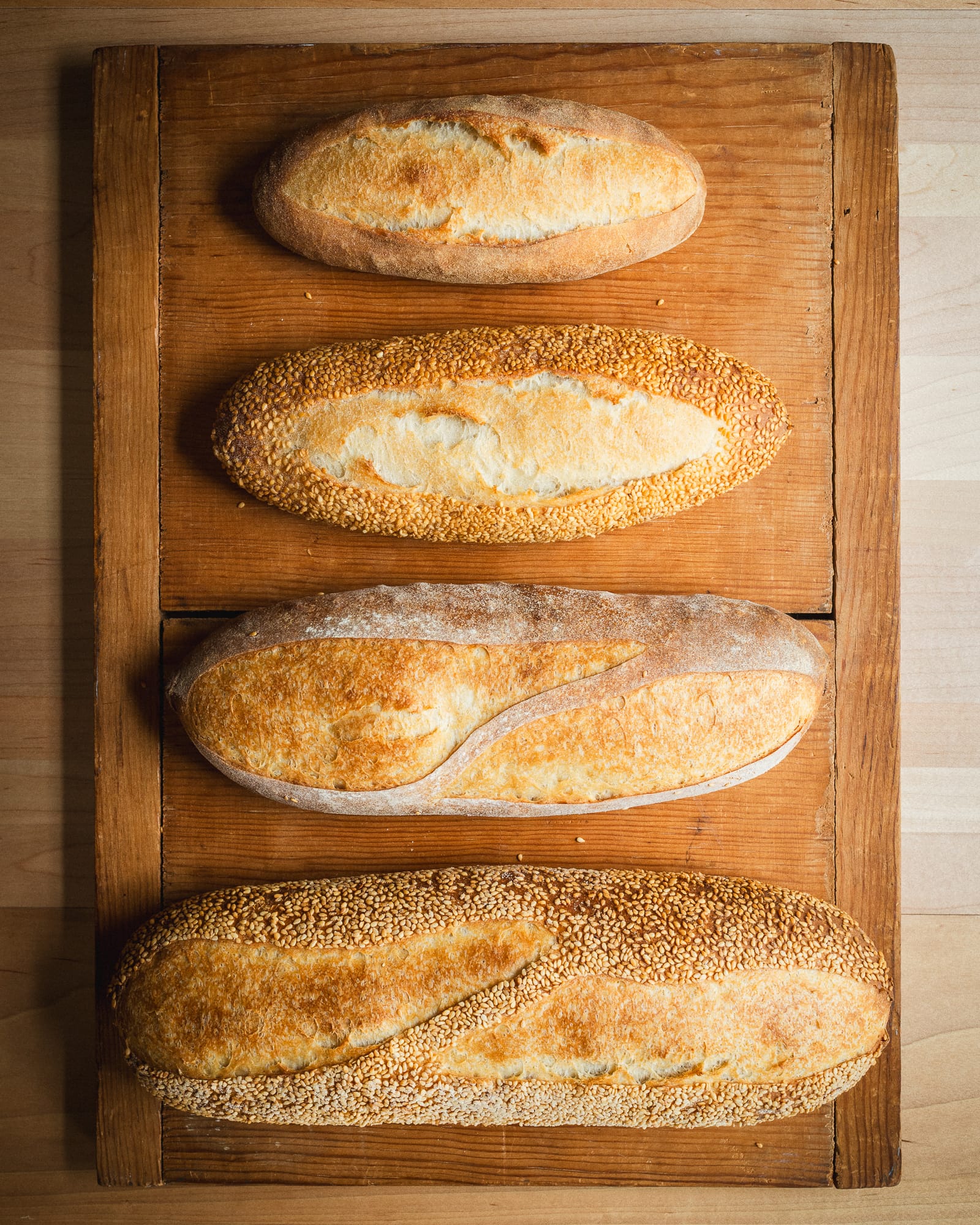 I've also been working on buns and rolls, including a sesame-coated durum flour submarine roll.
