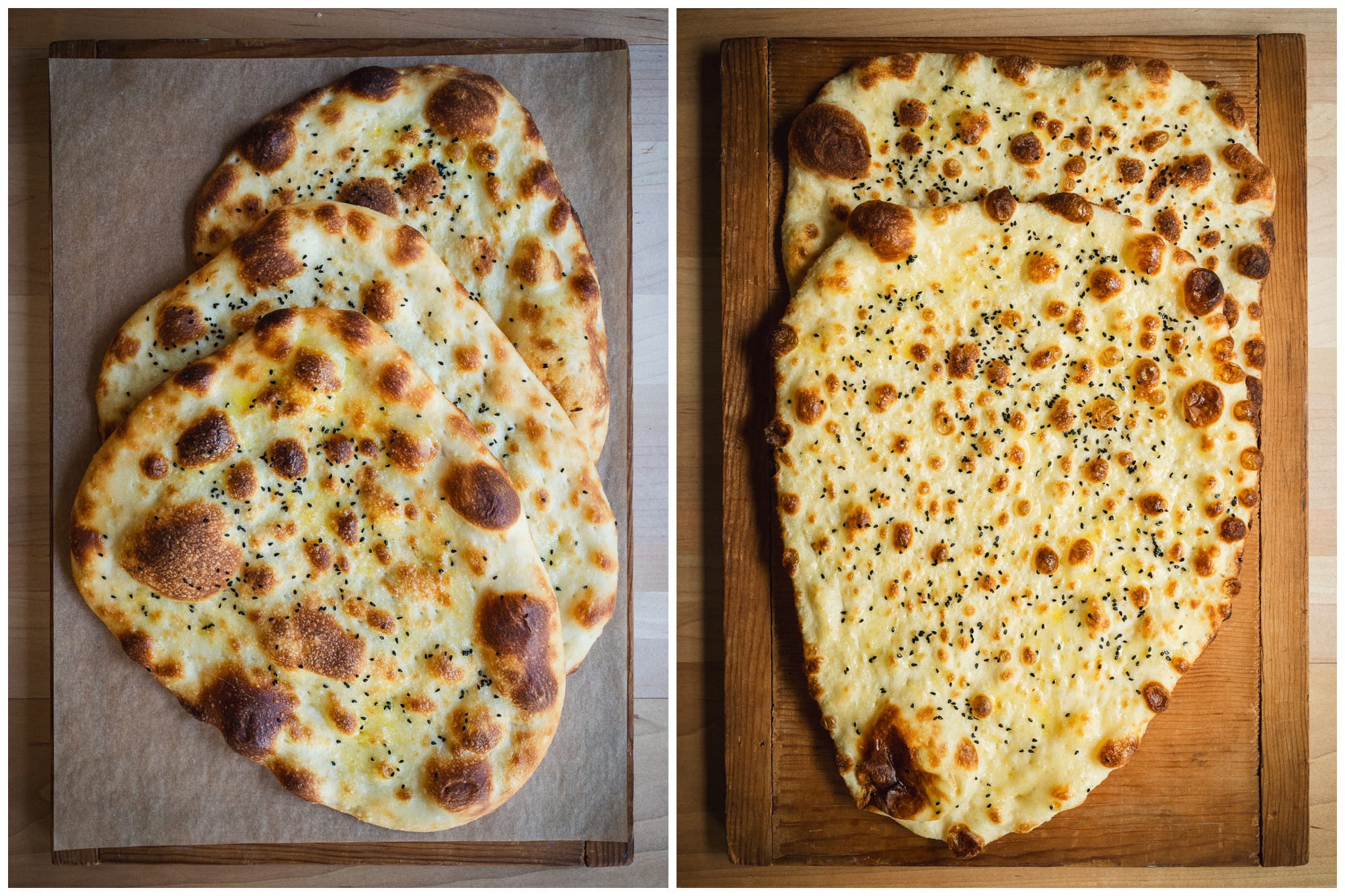 Lately I have been working on flatbreads, and I have a naan formula I am very happy with, though I need to split the difference between the two above formulas, one that was too low in hydration, the other too high.