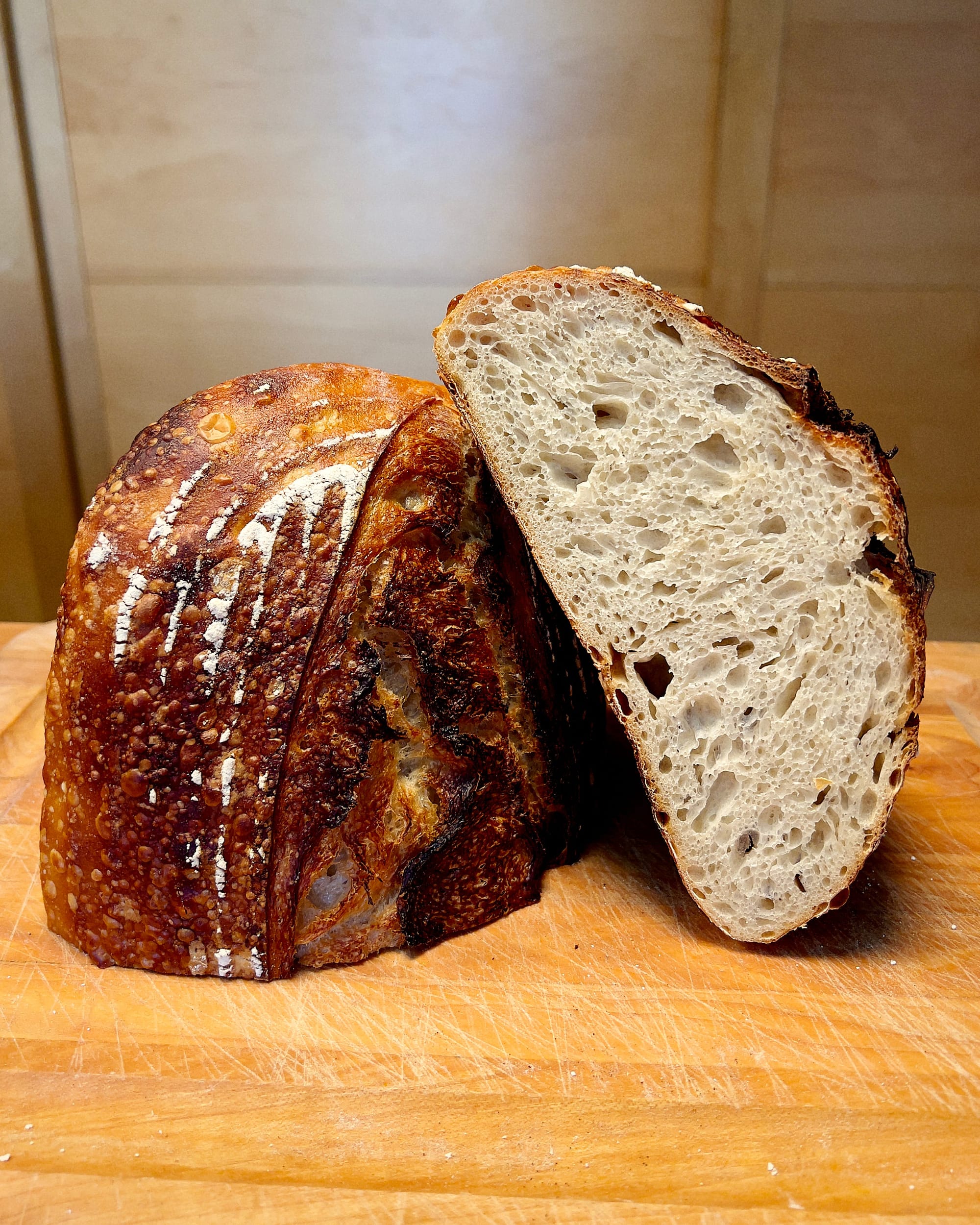 Finally, I’ve been making yogurt lately, and straining it, which has left us with a lot of tart, creamy whey. Naturally, I wondered how it would work in a bread ,and the answer is very well! It gives the loaf a pronounced lactic tang, just the sort of thing for those who like a punchy sourdough. It seems to make the crumb a bit chewier than normal, so I need to tweak the formula a bit to counter that, but I’ll share a whey bread recipe here eventually.