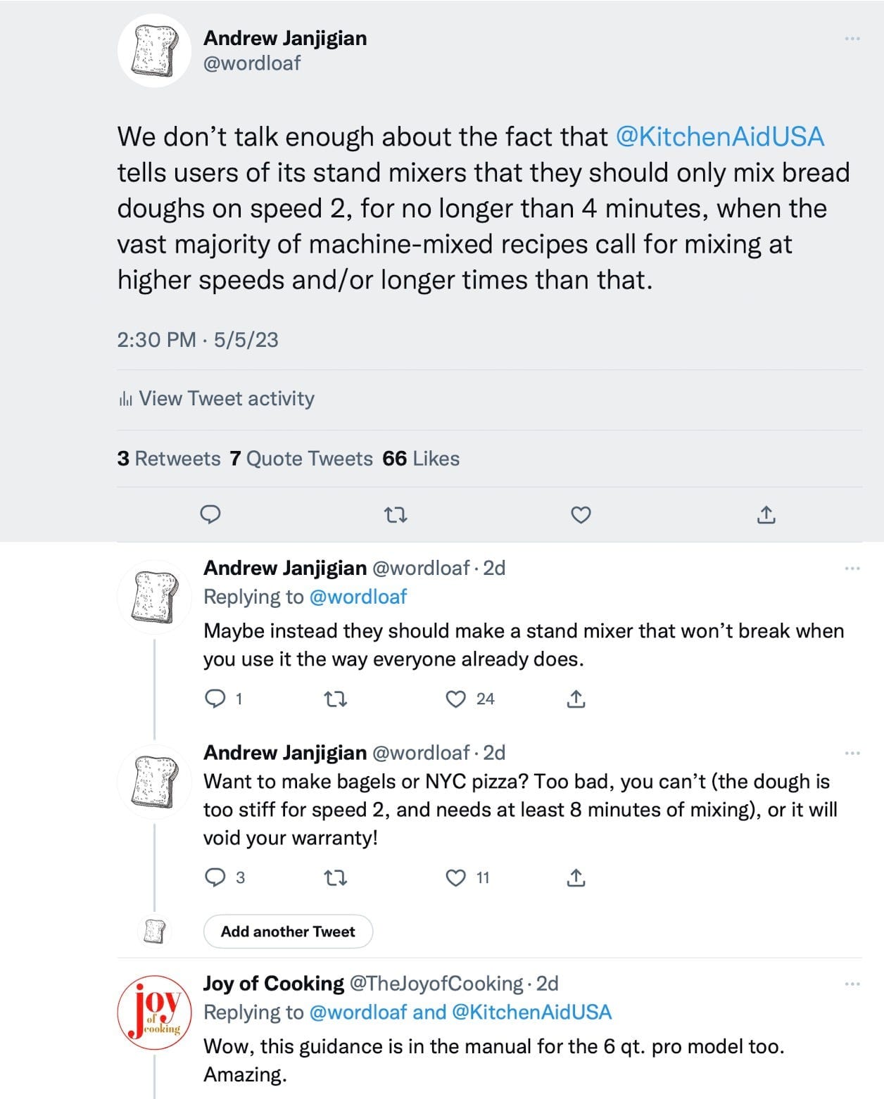 Happy Mondays, everyone. I went on something of a mini-rant over on twitter on Friday, about how the manuals for all models of Kitchen Aid stand mixers (including the $800, 8 quart, “professional” one) state that you shouldn’t knead bread in the mixer at speeds higher than 2 and/or for longer than 4 minutes at a time. Which obviously isn’t how I — or nearly everyone else in the known universe — write machine-mixed bread recipes, which poses something of a problem. I’m working on a much longer rant (and a general overview of using stand mixers for bread dough), to arrive sometime soon.