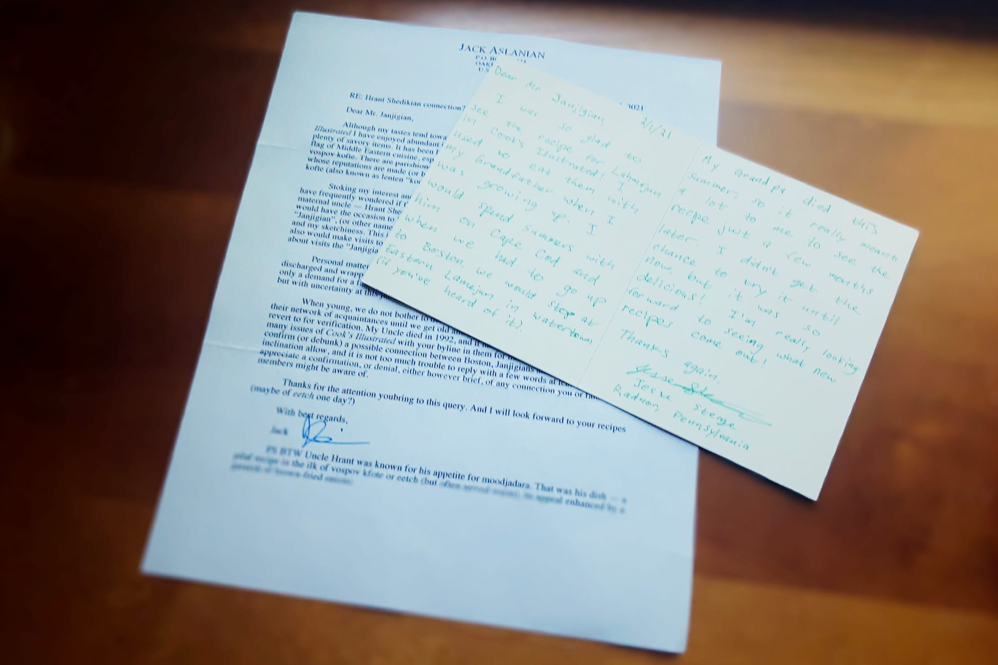 In fact, just last week I got the two letters pictured above, one from someone who was excited to see in the pages of Cook’s Illustrated my recipe for lahmajun, a dish he had fond childhood memories of eating with his grandfather, who died just months before the recipe appeared. The other from someone who was inspired by seeing my name alongside a recipe for vospov (red lentil) kofte to enquire whether or not we were related, since a late uncle of his used to speak fondly of a Janjigian from the Boston area. Both correspondents closed their letters to say they were looking forward to seeing future Armenian recipes from me in Cook’s Illustrated (one of them even made a request for the very next recipe I was slated to develop!)