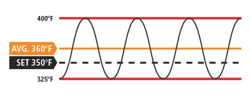 Better quality ovens program their thermostats to compensate for this temperature swing—they more or less “predict” when the rising temperature will hit your set temperature, and the burner will kick off sooner, coasting to a temperature crest just above your set temperature. They also predict when the falling temperature will pass your set temperature, and prematurely turn the burner on to stabilize the temperature so it doesn’t drop too far below your set temperature. This programming, however, isn’t based on real-time predictive feedback—it’s just modeled after the heating and cooling cycle of that oven model during product testing, i.e. the thermostat is offset to stop at 385ºF when shooting for 400ºF, etc.