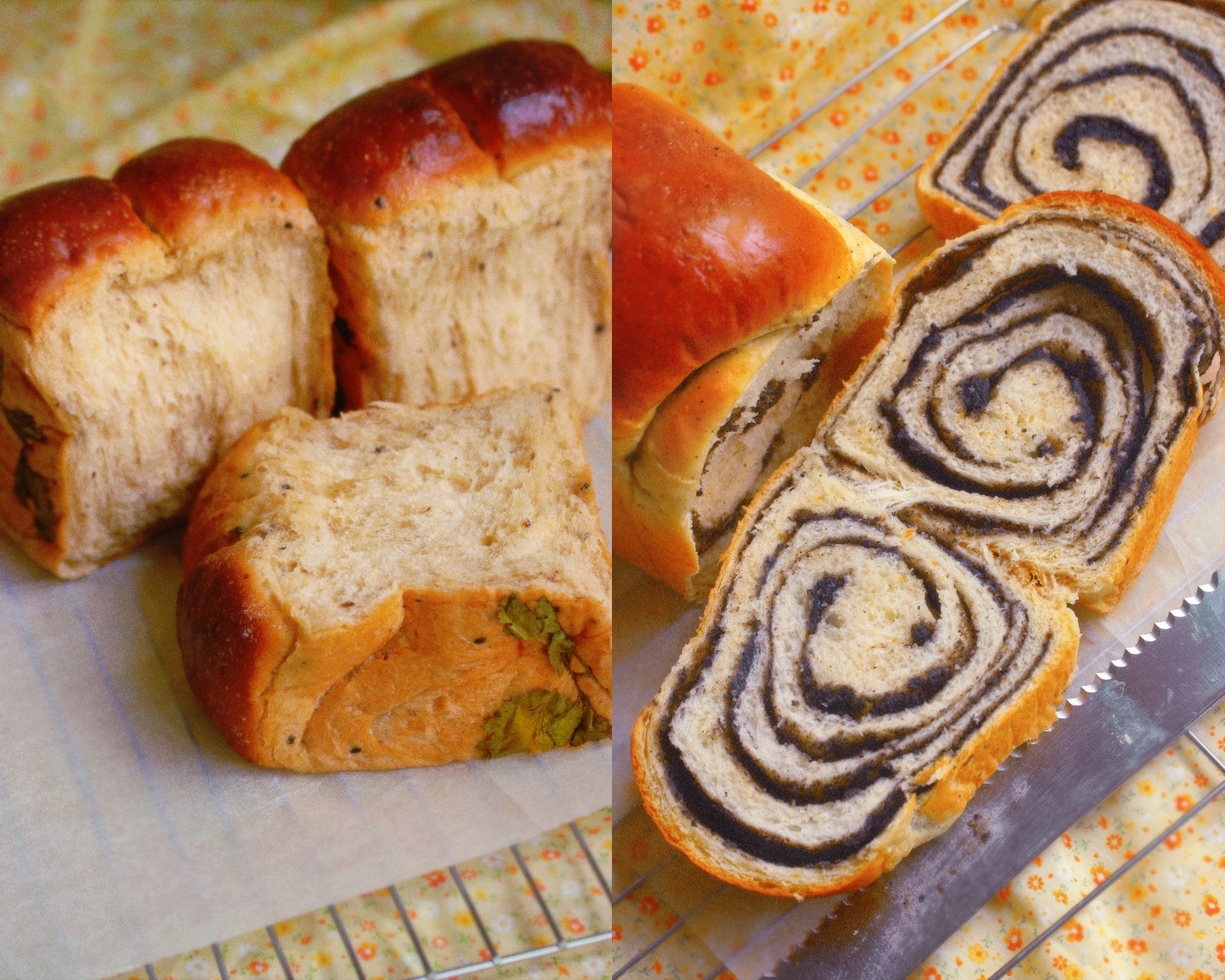 On the pictured loaves: the swirled version had orange + kumquat zest and was swirled with homemade black sesame sweet bean paste in a method adapted from Maida Heatter. The other, with coriander fronds adhered to the sides of the greased tin; a plain dough with ~15g of oat bran, ground flax, and black sesame added in.