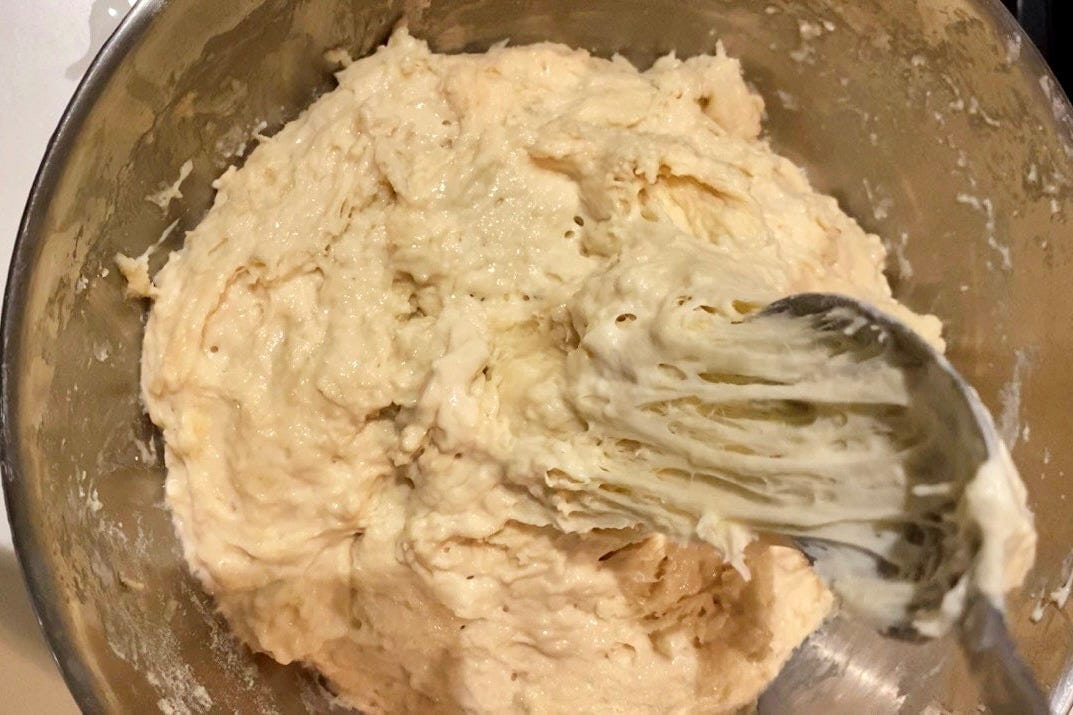 Let this rise at room temperature for 1-2 hours, covered in clingwrap, or until a long honeycomb structure of gluten is formed (you can pull a little at the side with your spatula or merely tilt the bowl to check). It should be 3-4x the initial size and smell sweet and alcoholic; there should be little air holes all over the top, spongelike.