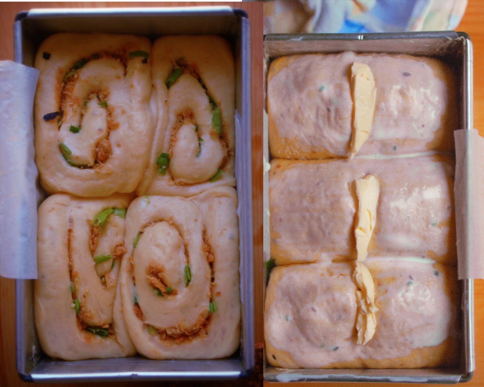 Flatten each ball with your palm into an oval. Roll this up, swiss-roll style, and pinch to seal. Turn the swiss roll 90 degrees such that the swirled end faces you, and gently flatten with your rolling pin. Roll this out into a long strip the width of the loaf pan, and roll it from top to bottom again like a swiss roll. Repeat and place the rolls side by side into a greased 450g loaf pan. Cover with a damp teatowel or clingwrap and let rise until doubled in a warm place, about an hour and a little more (I put mine in a closed, cold oven with a dish of hot water; in Singapore this took me 1 hour and 10 minutes). It should fill 80-90% of the tin.