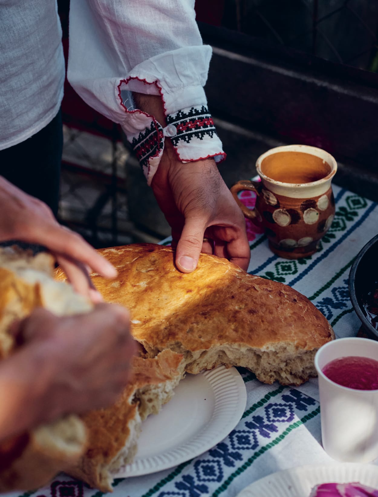 This recipe hails from Oltenia where the bread is made under an earthenware cloche called a țest (tzest). It has a direct lineage to ancient Rome, where baking was done under a testu or clibanus and placed into a wood-burning hearth. The cloche’s sides and top were covered with hot embers to ensure good heat distribution. In Romania, it was traditional to place the țest on the bare ground, but in more modern times we’ve used flat, stone or brick surfaces. I have also seen it used inside the house, where the owners had an old, open fireplace and put the cloche in there. I’ve adapted the method for a standard oven to give similar results. The dough is pierced before baking so that it doesn’t puff up and has a soft, slightly gooey crumb, utterly moreish when served warm.