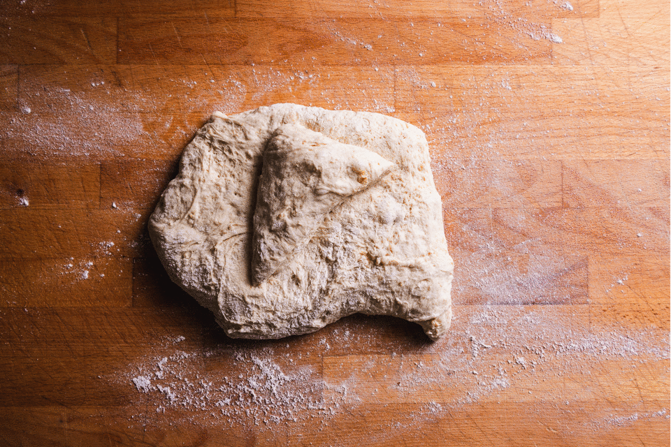 Flour top of dough and surrounding countertop. Using bench scraper, loosen dough from counter. Shape as desired.