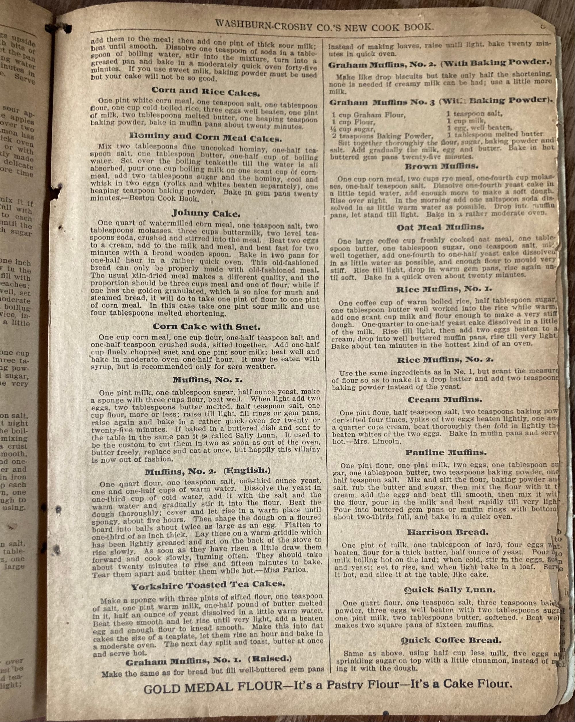 Another easy yes was a Gold Medal Cook Book from 1904. This I got for the flour ads, lush with Gibson girls ordering fine flour on a telephone, and dapper men moving flour barrels. At the bottom of each page, Gold Medal Flour is called a biscuit flour, bread flour, pastry, and cake flour! The bread pages have good information about the ways people made bread, and what quick breads they made—brown muffins had cornmeal and rye, my favorite flour combo. The reader is encouraged to read the article on white bread on page 70, which argues that white and wheat bread are equivalent in nutrition.