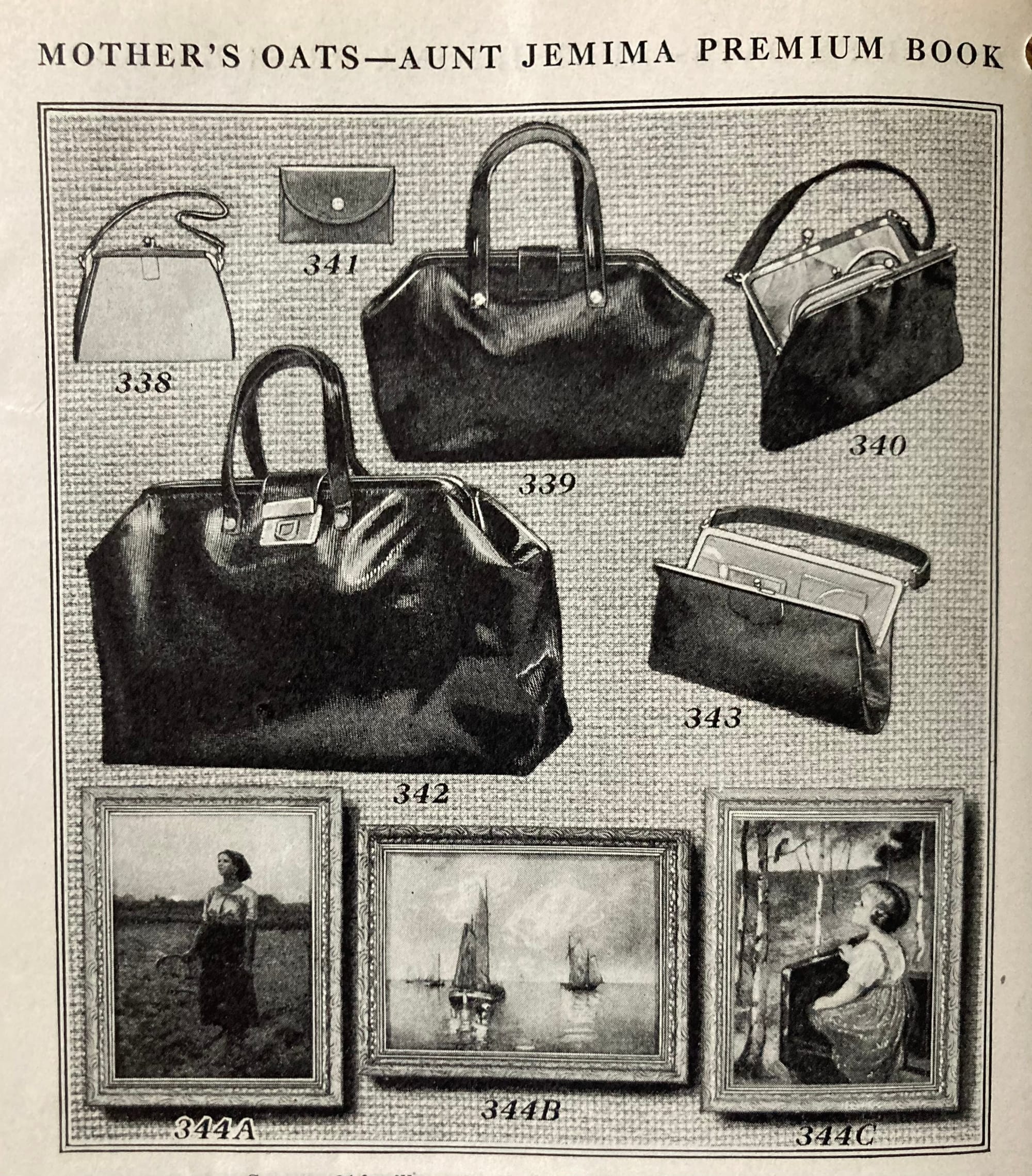 Bread Recipes & Premium List of the Mahoning Valley Bread Co., New Castle, PA. Quickly, I could see that this pamphlet preaches the gospel of buying bread, and that I needed to have it as a companion to The Story of the Staff of Life. This little book criticizes the housewife for trying to bake bread, when she has no chemist to analyze flour! And her ovens, oh they’re not good. But there’s recipes that use bread and breadcrumbs, and lots of options for what I could have gotten with coupons from their Mity-Nice and Valley Queen breads, like a rough-rider suit, a bread knife, or a catcher’s mitt, and any of these purses and pictures.