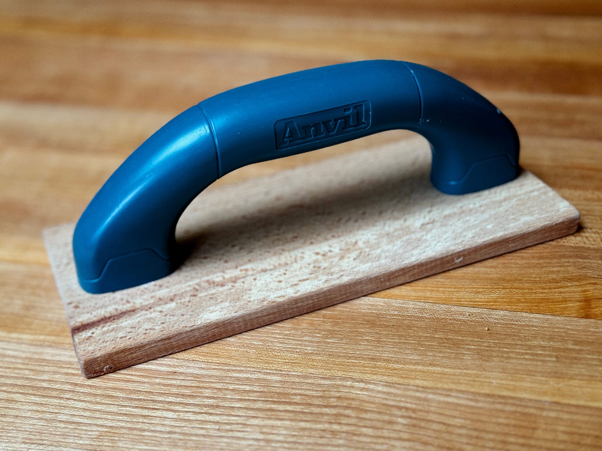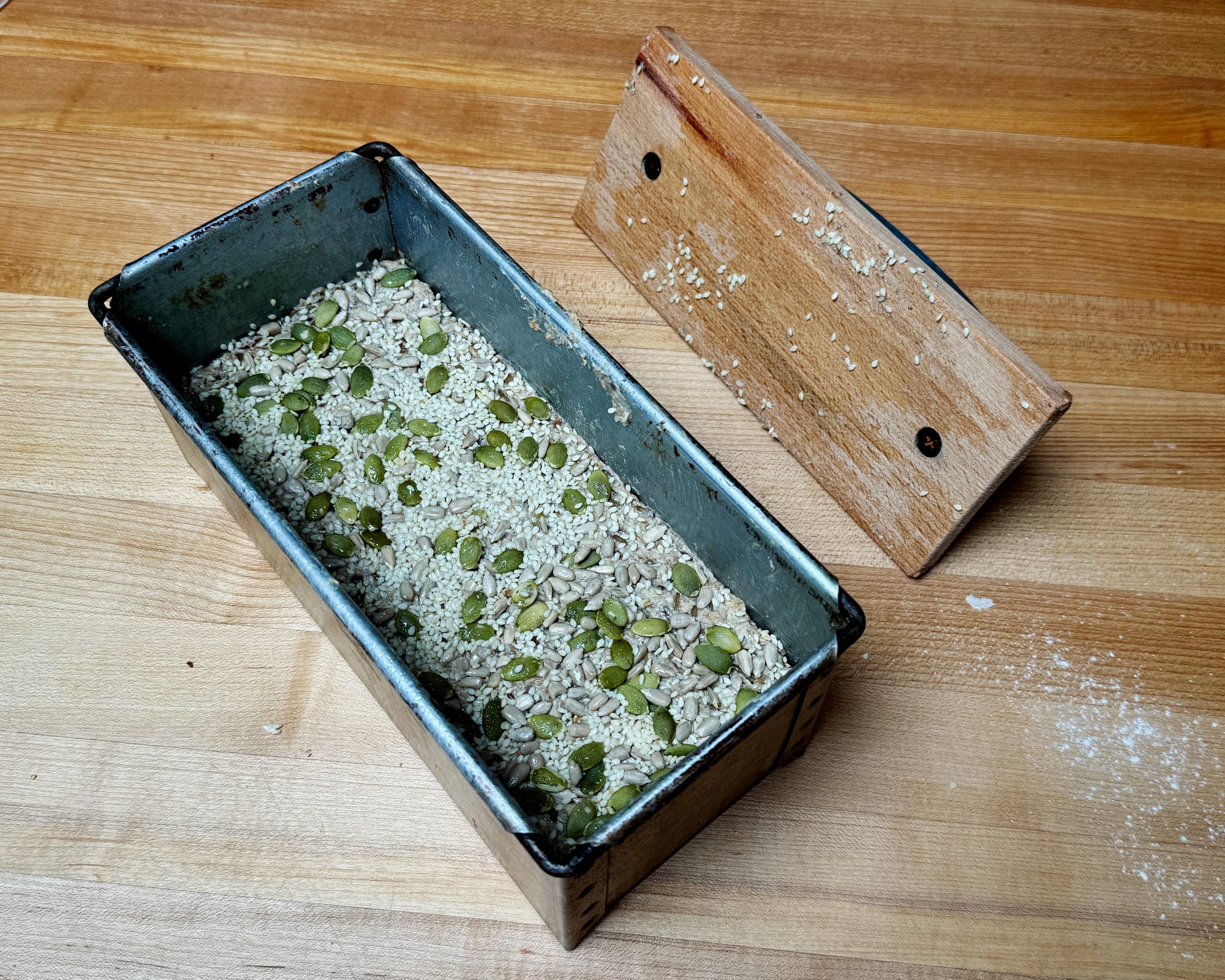 Some bakers use a wooden press—a flat wooden board slightly smaller than the pan, mounted to a handle—to quickly and easily flatten their panned ryes. If you are handy, you could make your own, but there's an off-the-shelf option that you can find at any good hardware store: a wood concrete float, the tool that masons use to smooth out concrete. I found one that was the perfect width for my pan, and only needed to be cut down in length and given a coating of food-grade oil. Using a press is especially helpful for getting seeds to adhere to the top of the loaf, since you can really press them down into the dough.
