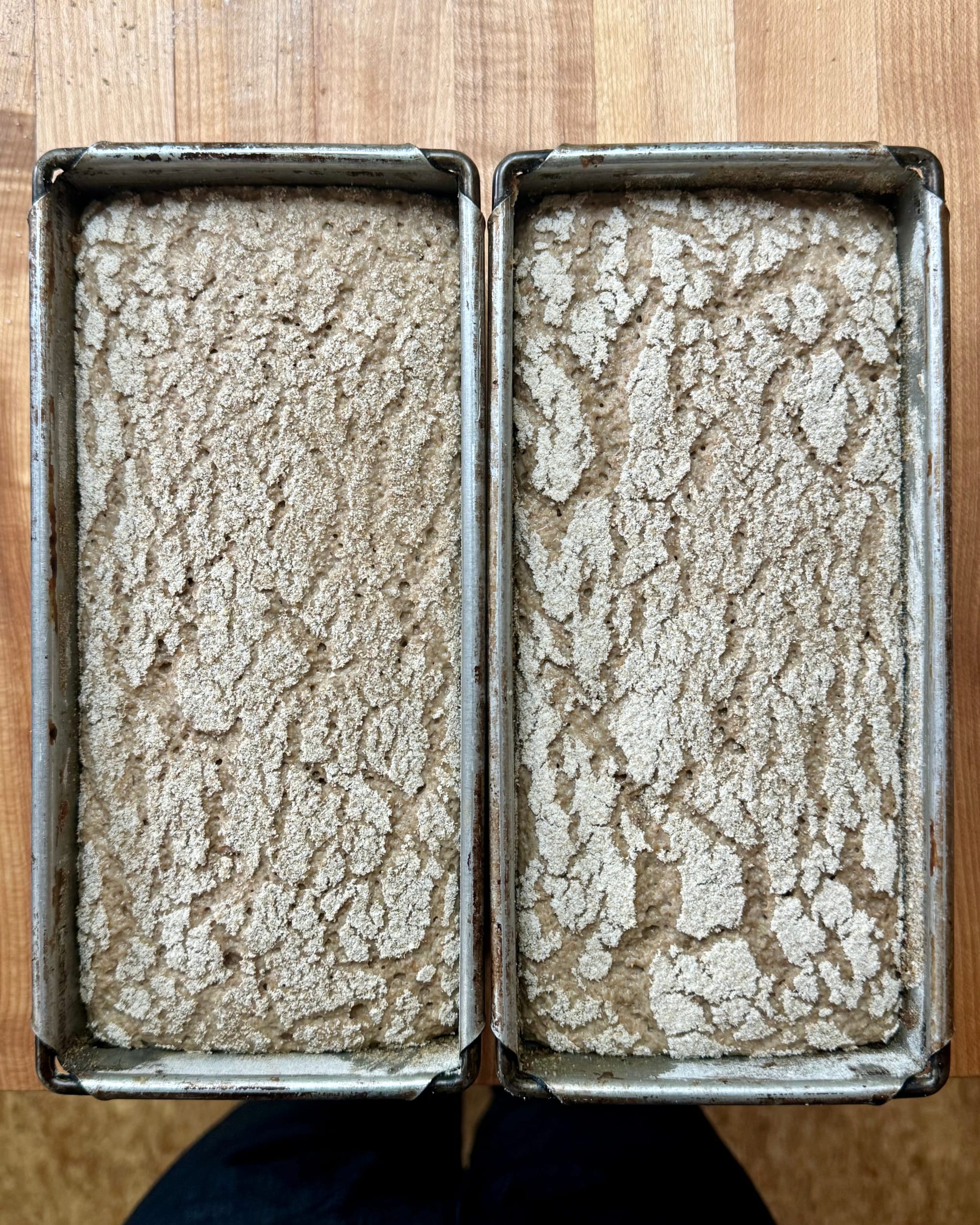 While expansion is obviously an important marker for readiness, the most important one is the condition of the dough. When a rye is ready for the oven, the dough will just be beginning to break down—the top of the loaf should have a nearly flat (not domed) surface, riddled with cracks, and within the cracks you should see tiny pinholes formed when interior bubbles burst open. The goal is to push the fermentation as far as possible, but not so far that the loaf collapses. Overproofing usually doesn't happen rapidly, so it's fairly easy to avoid if you are checking on the loaf regularly. (If the finished loaf ends up with a depression in the center, it may mean you pushed it a little too far, and should bake the loaf sooner next time.)