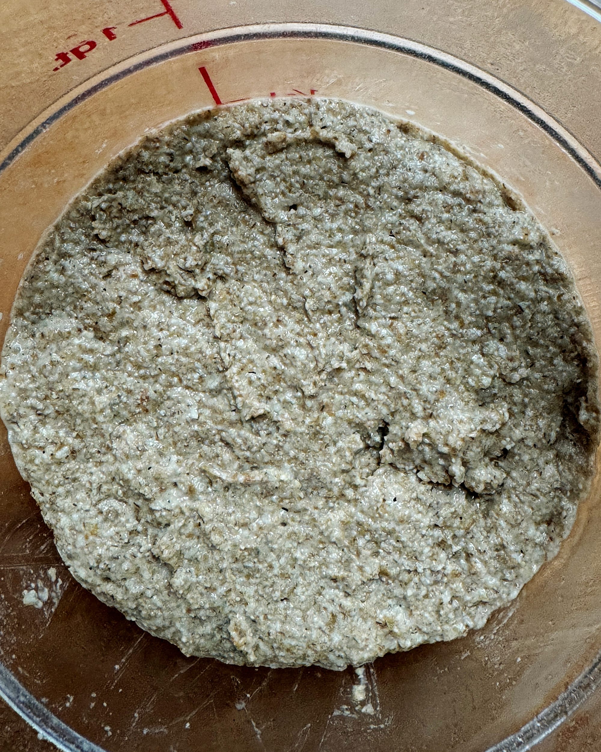 A common refrain in rye baking is that a properly hydrated and mixed rye dough should flow. It took me awhile to sort out exactly what this meant, but now I understand it as a dough that is thick and cohesive, but still moves when left to its own devices. Neither loose and liquid like a batter, nor so stiff that it just sits there—like lava (not water). Flow will be especially evident right after you stop mixing or stirring it: it should slump a little, but not flatten out entirely.