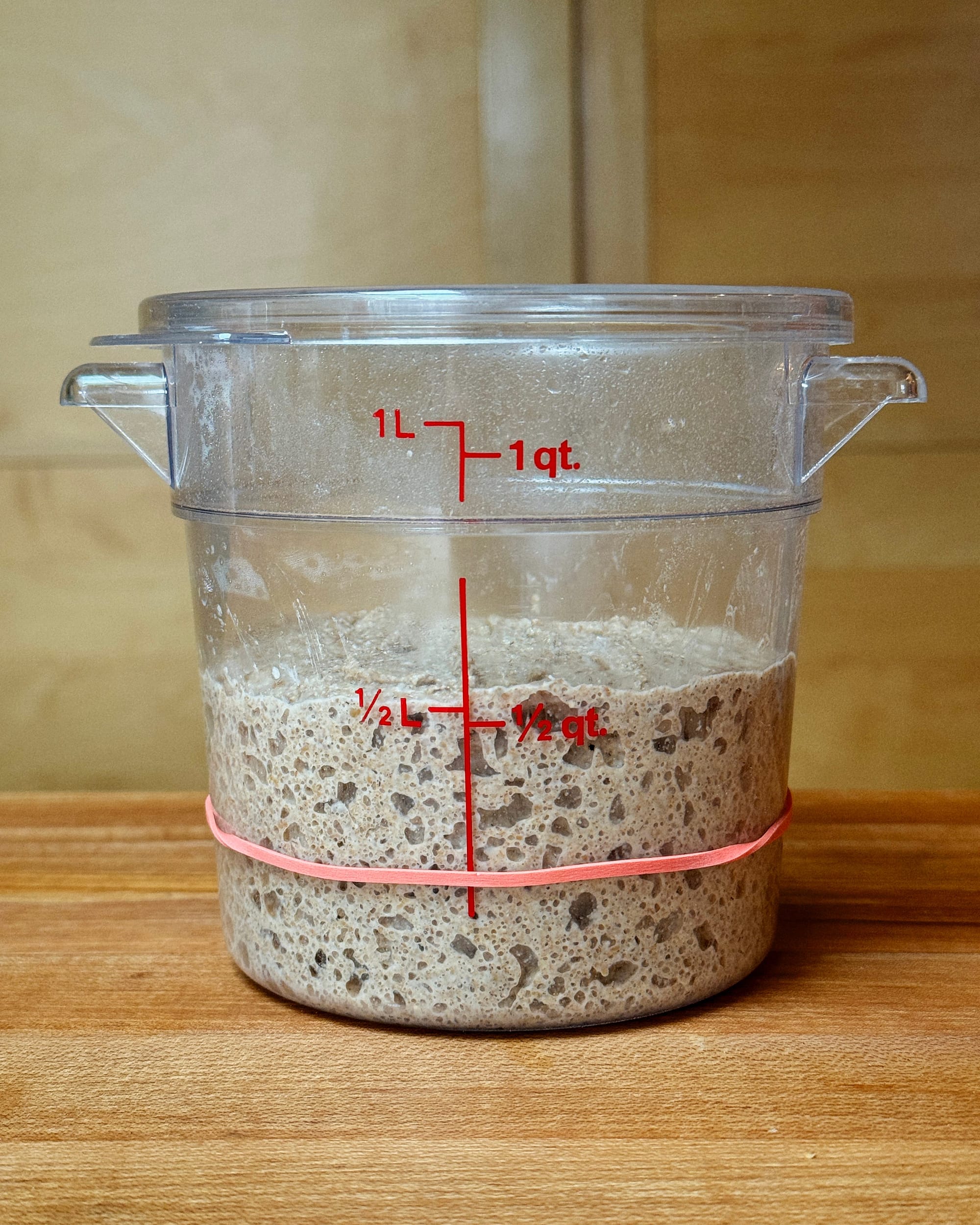Many bakers build their sours at reduced hydrations (around 80%), but I've found that 100%-hydration works just as well, and I find it is easier to judge proof based upon expansion when the sour is on the loose side. When it is ready to use, it should be about doubled in volume, filled with bubbles, and just beginning to recede and break down (much like a rye loaf when it is ready to bake, with cracks and pinholes dotting the surface). There's a window of a few hours for use once it is ready, so long as it doesn't collapse completely.