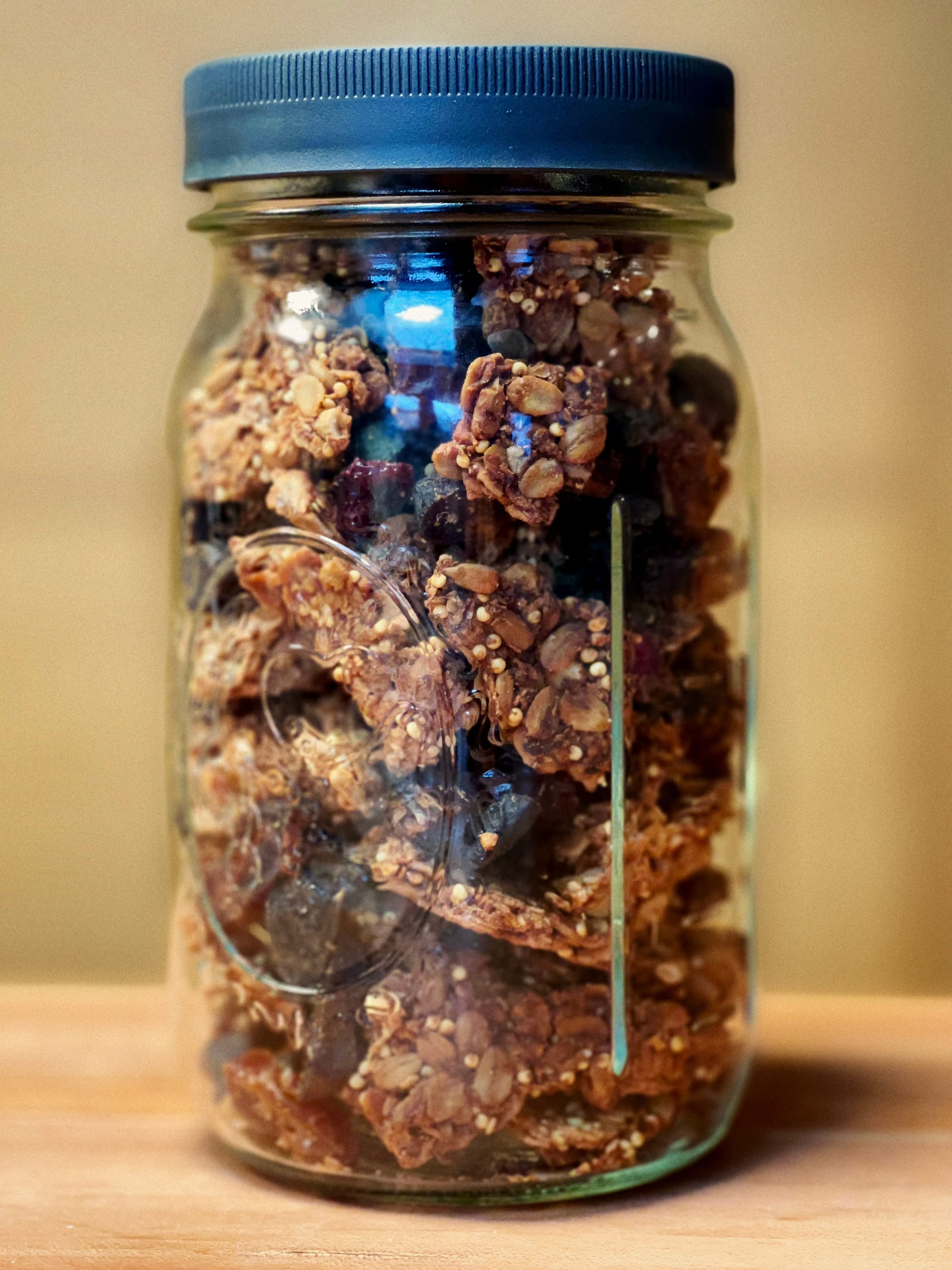 As for the granola: it’s from a recipe is inspired by my friend Jessica Fechtor’s granola formula—itself inspired by one from Jamie Oliver—which is sadly no longer online. It also borrows a key trick from a recipe by Mitchell Davis, who had the genius idea to use sourdough discard as the binder. Not only is that a great way to get the granola to clump without needing to use egg whites or an excess of sweetener, but it also lends the granola a nice savoriness. (One interesting thing I have noticed with baked-to-dryness sourdough discard recipes like this one is that the volatile acetic acid sourness dissipates in the oven, leaving behind only a pleasant lactic tang, even when the discard is on the old side.) The recipe is attached below...