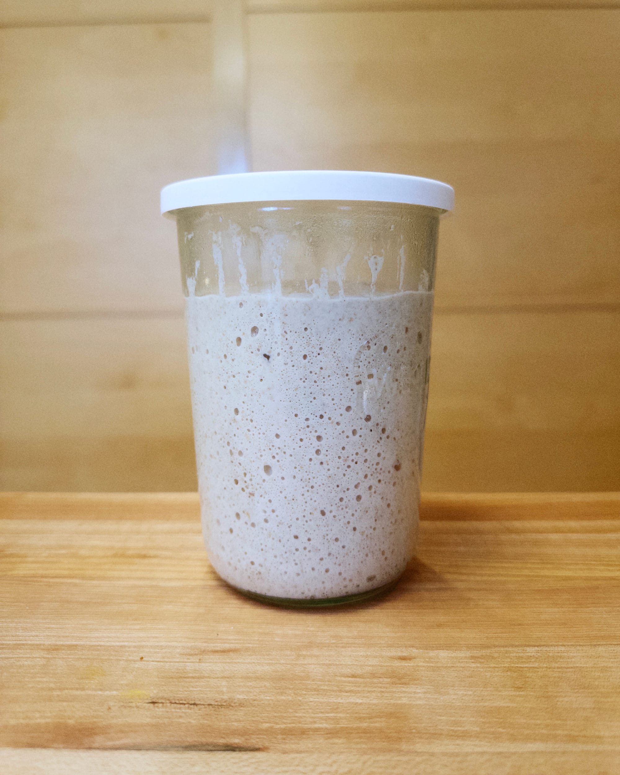 The next morning I’ll add 50g flour and 62g hot (~105˚F/40˚C) water to the jar, which will bring its hydration to 100% and its temperature up to about 85˚F. I’ll then proof it at 82–85˚F for about four hours, by which time it should be about tripled in volume and ready to use. (It’ll remain stable for use for another hour or so, but if I cannot use it right away, I’ll move it to a cooler spot to slow it down until I can, just to keep it from overproofing.) Proofing warm and building it into a liquid levain will ensure that it moves quickly, so it will be ready for use when I need it.