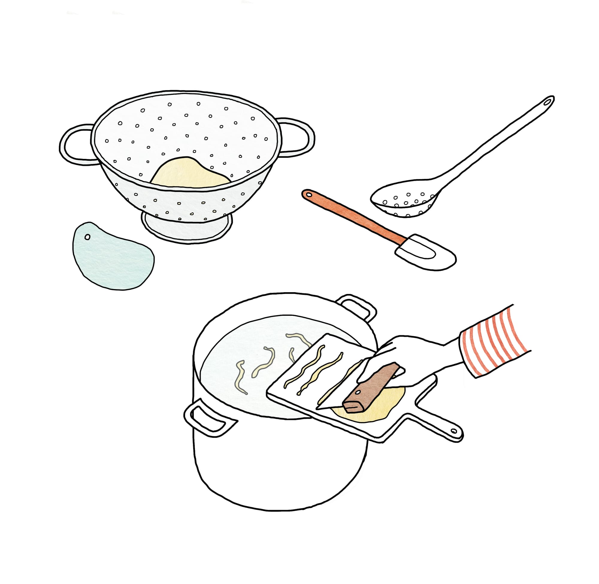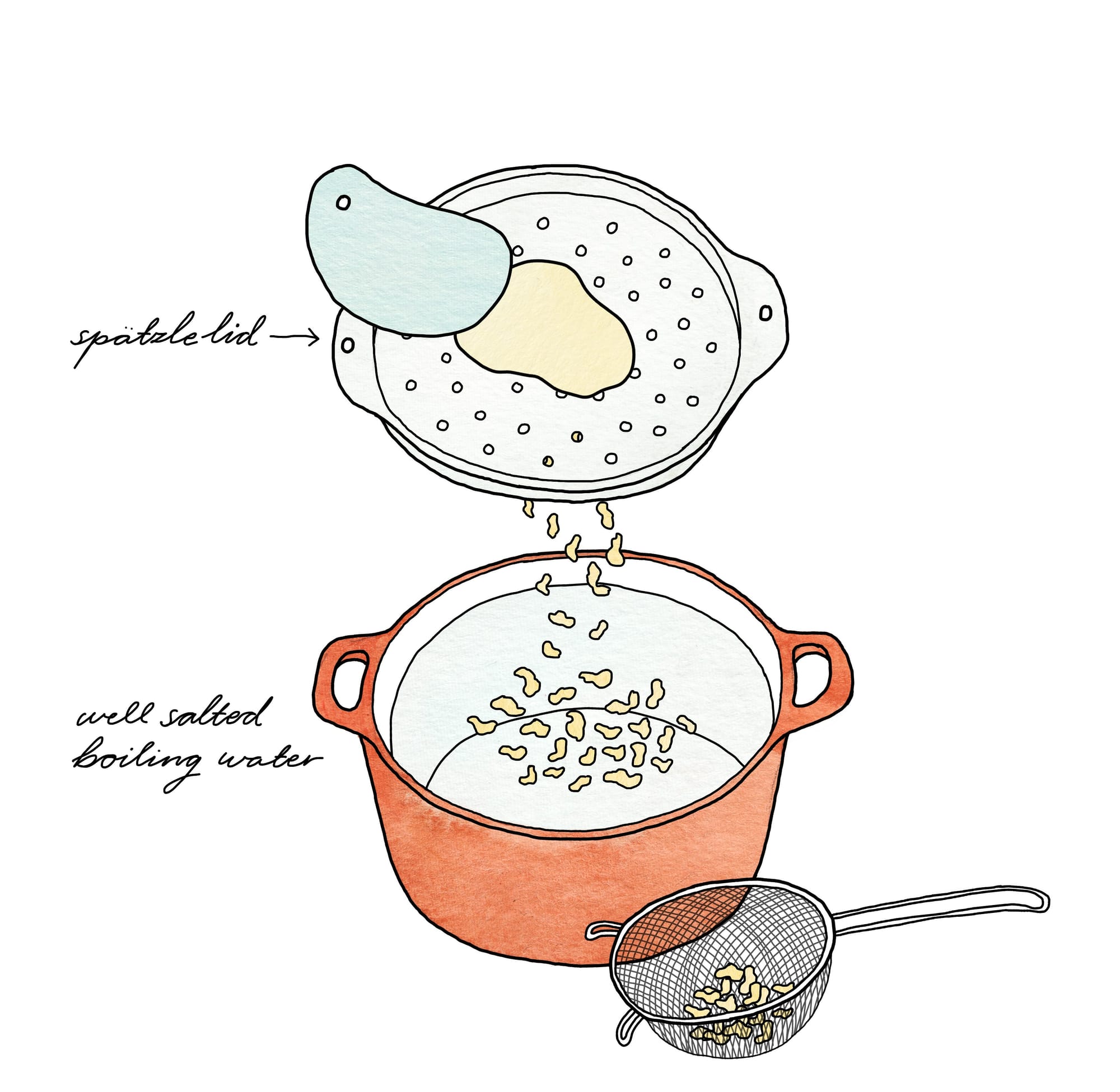 Spätzle are easy to make, and delicious, whether served alone as a pasta tossed with a little butter and cheese, as a starch alongside a saucy stew or braise, or as a noodle for soups. As Johanna illustrates, you can form them all sorts of ways, using a dedicated spätzle maker, a spätzle “lid”, a wide-holed colander or perforated spoon and a flexible dough scraper, or the aforementioned dough scraper and cutting board.
