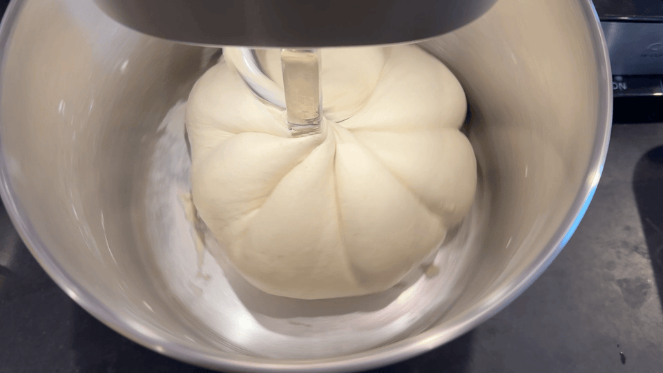 - One way it's obvious that <1000g batches of dough aren't mixing efficiently is that the dough never forms a pumpkin. To overcome this, you might have to occasionally (and carefully) stick a spatula into the front half of the mixer while it is running and use it to guide the dough toward the hook and breaker bar, so that it remains in contact with the hook as much as possible.