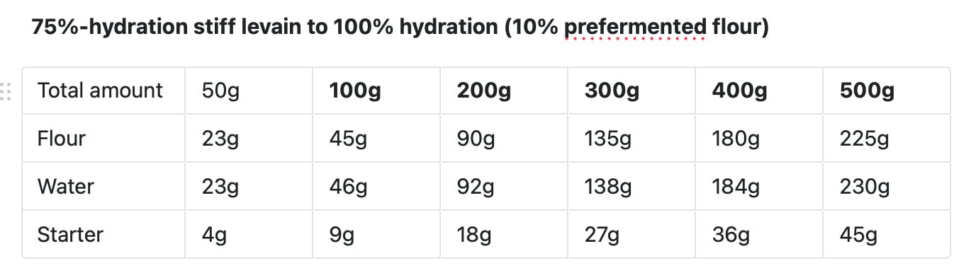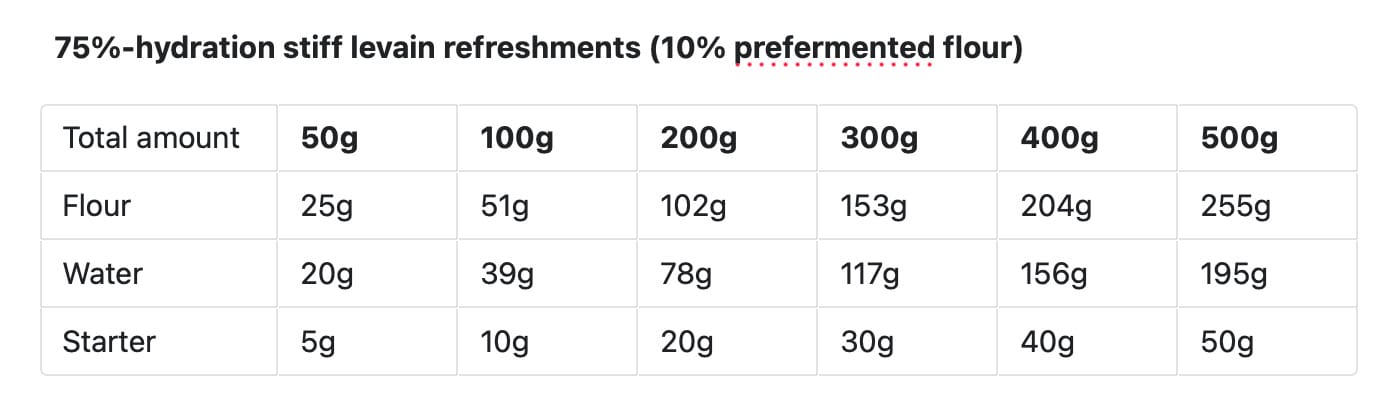 As I mentioned several times above, it’s a comparatively annoying to calculate the amounts needed to mix up a stiff starter, so it’s helpful to have a “recipe” handy. Here’s a cheatsheet for building amounts of 75% hydration starter from 50 to 500g, containing 10% prefermented flour (~12h to maturity):