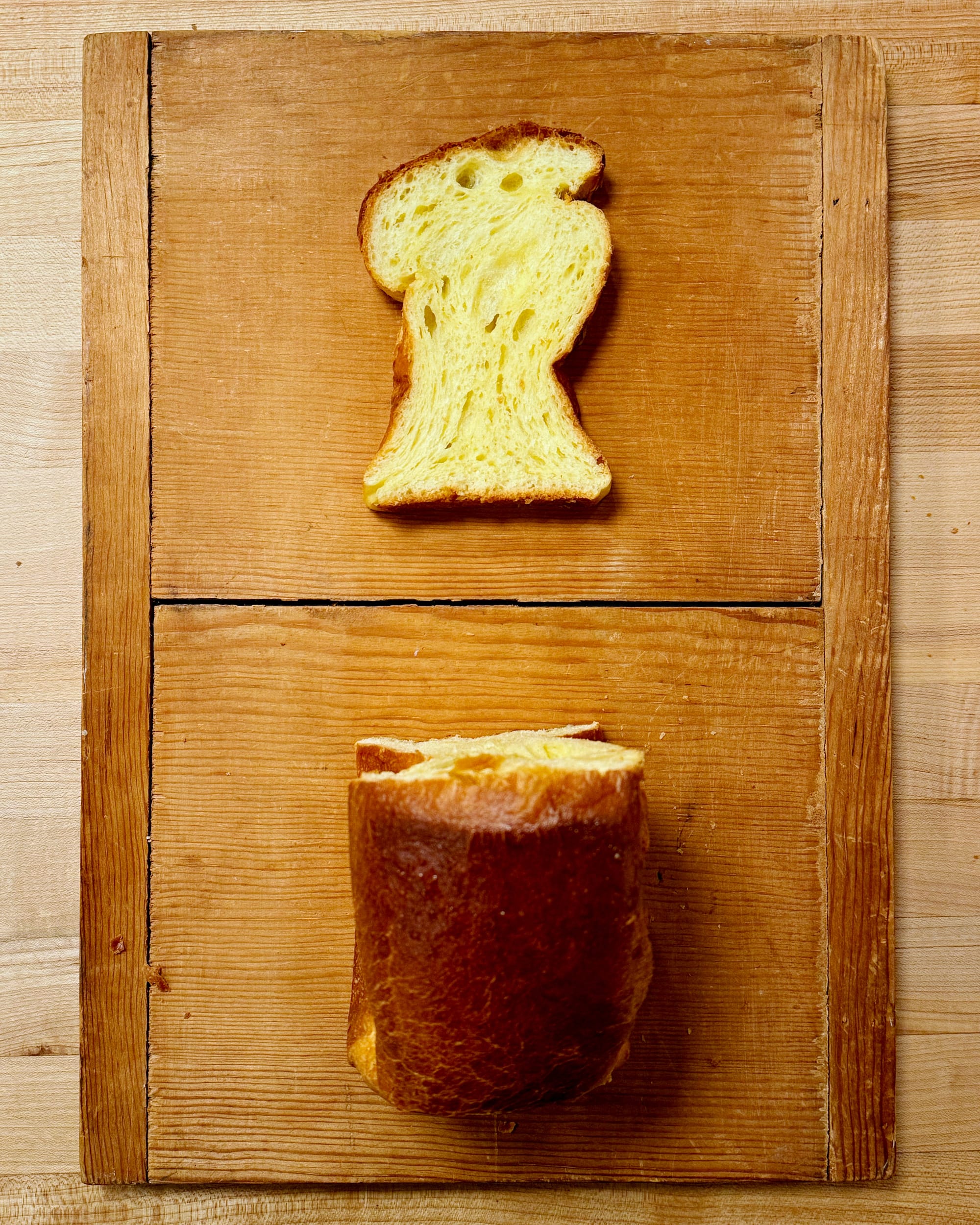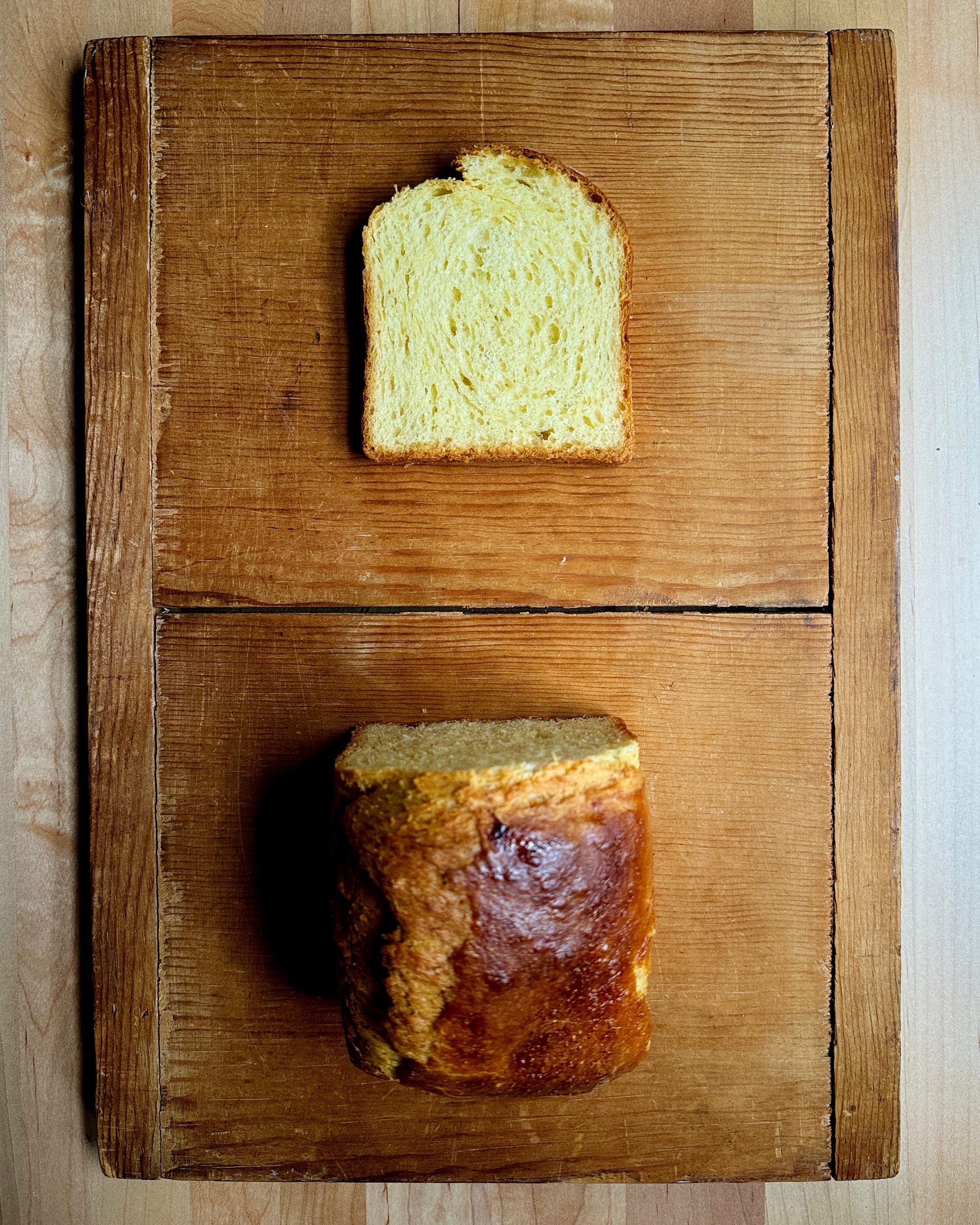 So for my next test, I went back to my usual approach, but developed the dough minimally—six minutes on low speed, after which the dough was uniform, but still shaggy and sticky. I don’t love working with sticky doughs, but since all of my enriched bread formulas get moved to the fridge to chill them down and firm them up before shaping, it’s not necessarily a dealbreaker. Still, I was skeptical this would give me anything other than a dense foam brick, and I baked it off with little confidence. Here’s what I got: