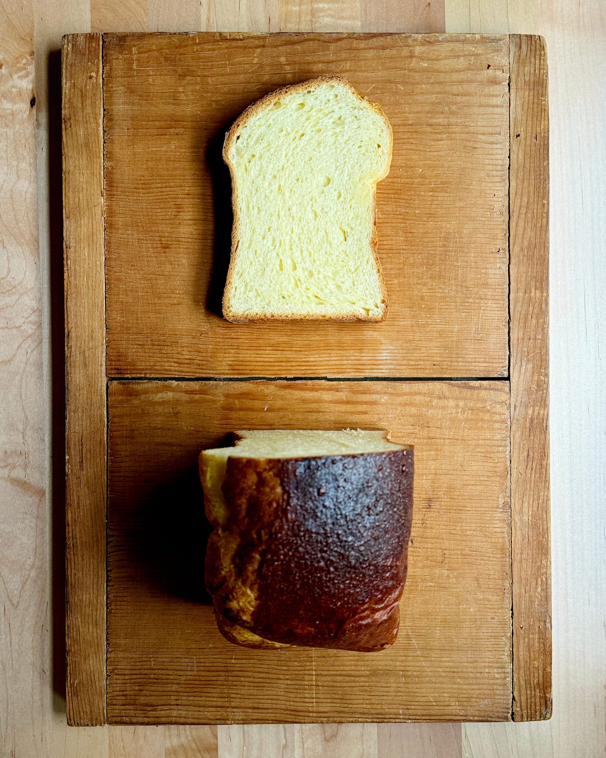The thing is: you do compromise volume and crumb openness when you do this, as should be clear. But the crumb on the “undermixed” one is plenty open enough for me, and it is a compromise I’m willing to make to keep my pan loaves square. And you can easily make up for lost volume by simply increasing the amount of dough you put in the pan. (In my case, I didn’t need to, since the overmixed loaves were far too huge anyway.)