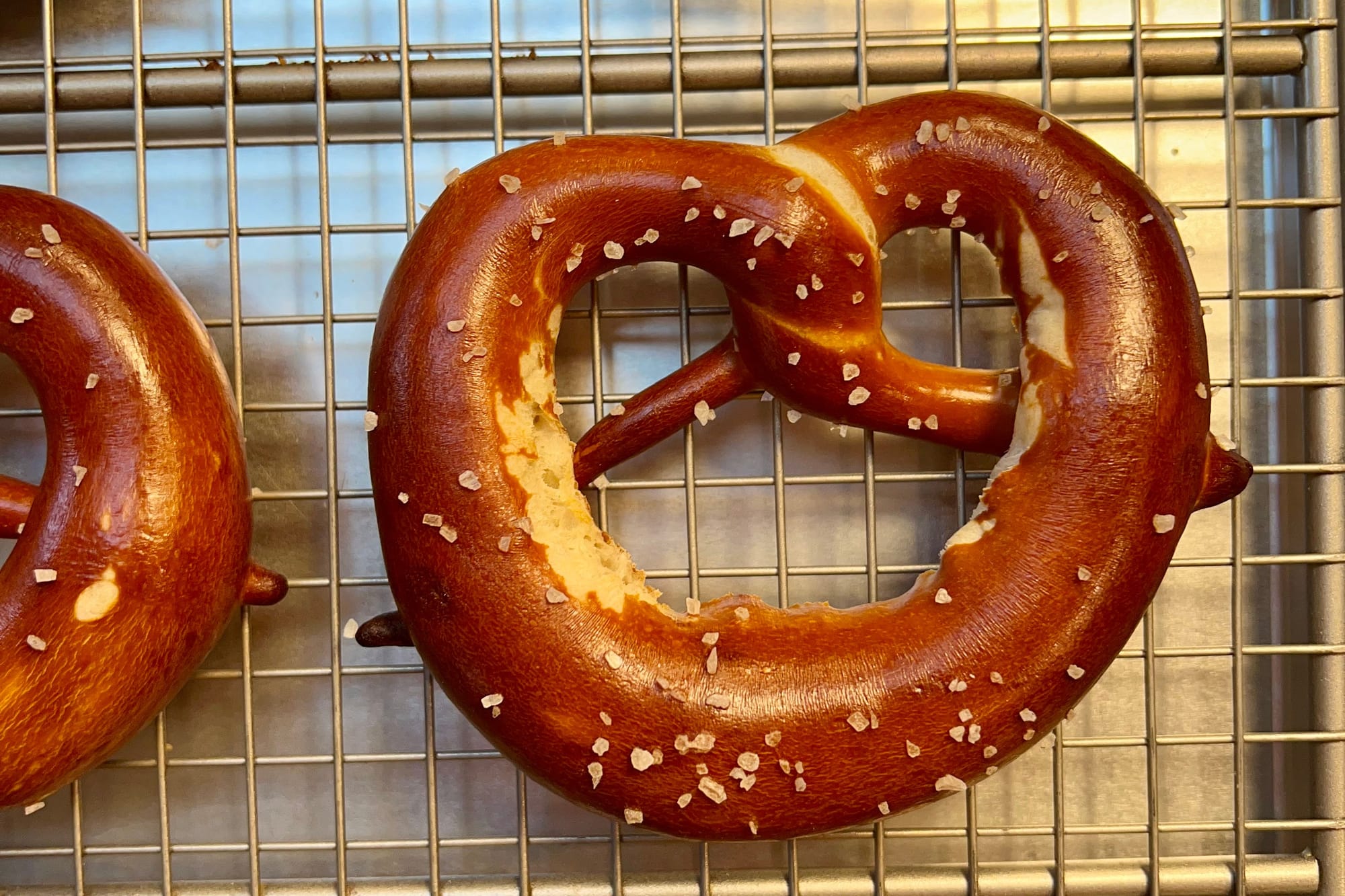 Eventually, I tried three things that I didn’t see in any recipes. One, I added a poolish, a yeasted preferment known for (among other things) making doughs more extensible. Two, I jettisoned any step that might develop gluten: instead, I switched to a hand-mixed dough with no autolyse step and skipped all but one fold (which I needed to ensure the dough had an even texture). (This no-kneading trick is one I stumbled upon for my King Arthur kouign amann recipe and have used a bunch of times since.) Three: I dialed the yeast way down, finally landing on a number that was 30% of what even the next-lowest recipe used. And four, I eliminated the final proof entirely—once the pretzels are shaped, they get chilled to firm them up and baked.