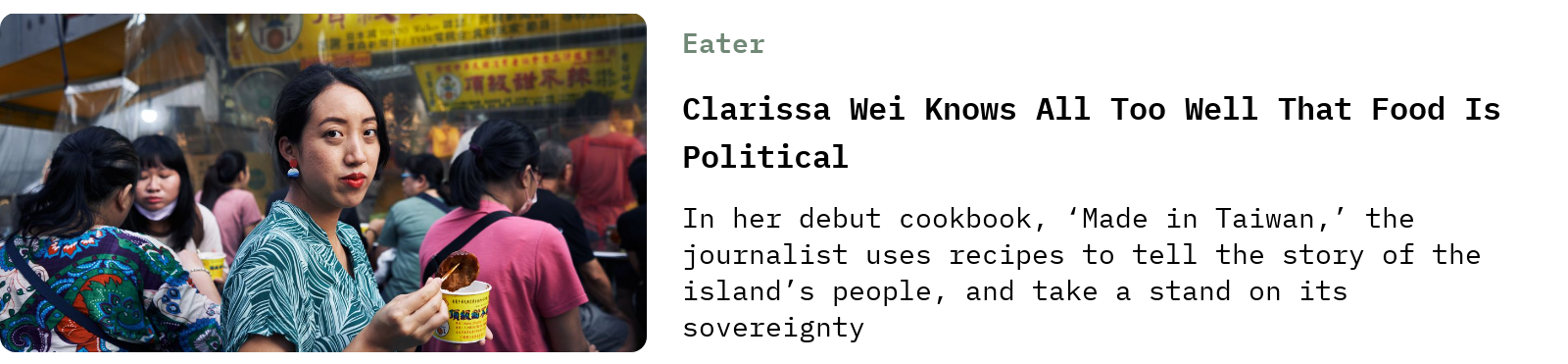Made in Taiwan is a love letter to the food of Taiwan by , and a forceful statement in favor of the island’s sovereignty relative to mainland China. As Wei writes in the introduction: