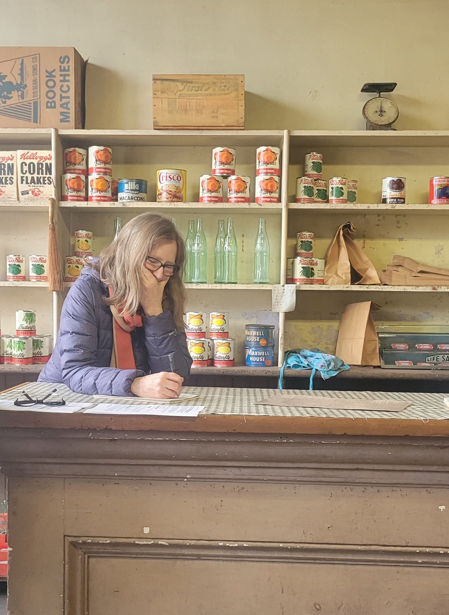 Our job for the day was to help the center think about how the history of bread could inform further storytelling. Reher staff led us through the tour and told us how people responded to different elements. We started in the storefront, which has shelves with different canned goods, and a life-size cutout of Sadie Reher, one of the sisters. We learned about oral histories that help root the tour.