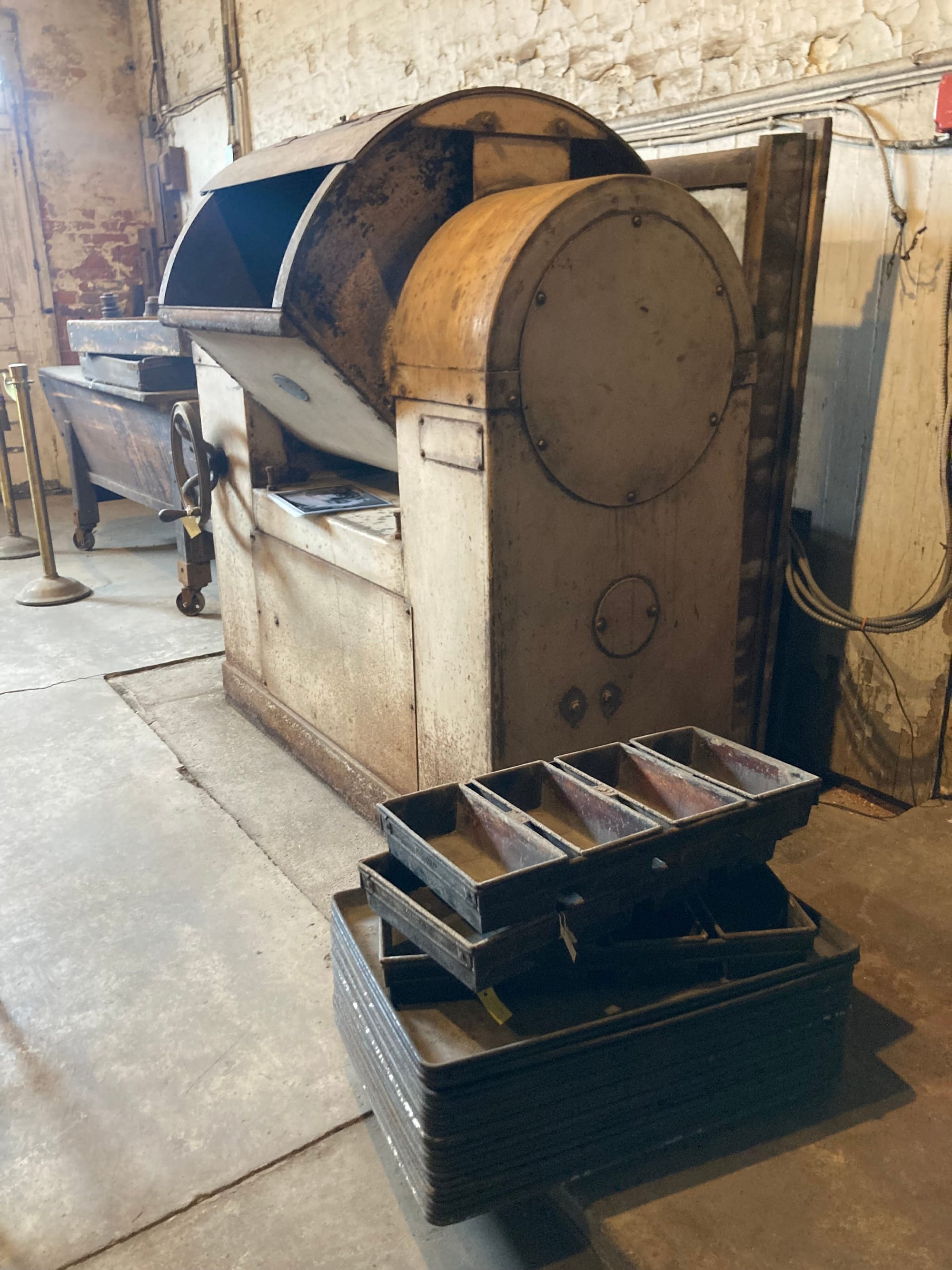 The bakery room has a huge brick oven, a mixer, and a couple of troughs on wheels topped with boards, that’s likely where the bread was shaped. There’s no refrigeration, so retarding dough would not have happened. The mixer was bought in the 1940s, as business in the Catskills grew. The only evidence of a dough divider is a pamphlet, and that could have been just a sales pitch, not proof of purchase.