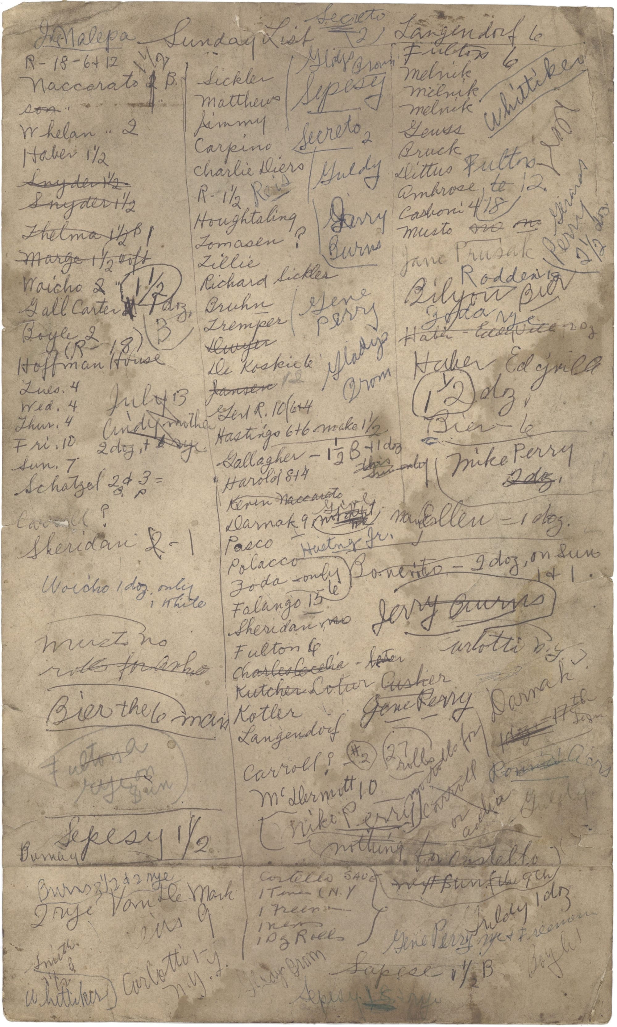 The Reher family ran their bakery from 1908 through the early 1980s and donated the building to Jewish Federation of Ulster County. Among the building’s artifacts is a handwritten list of families who picked up rolls Sunday mornings. Organized by the times church services let out, the list has names, some numbers, and a few capital Bs to indicate a preference for rolls with bumps, rather than smooth tops.