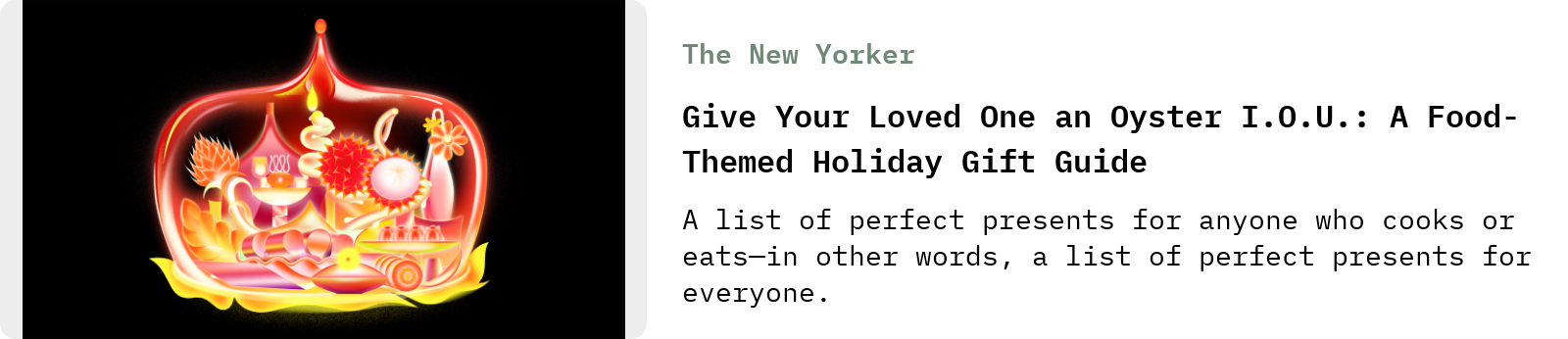 That’s it for my list. In case you still need ideas, here are two great food-related guides from others: